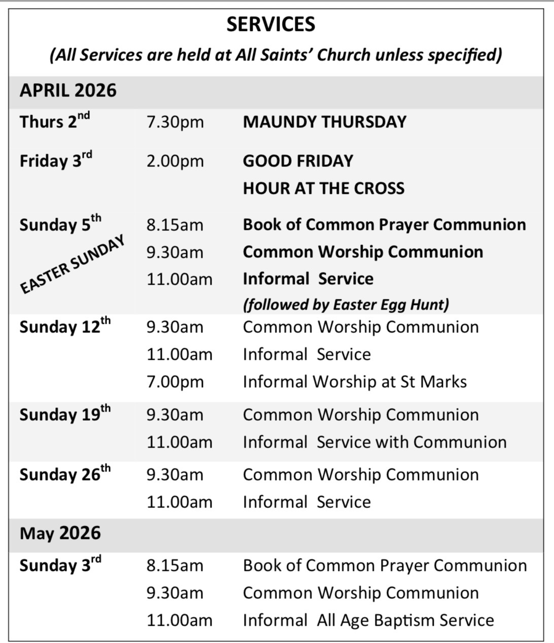 All services held at All Saints’ Church unless stated otherwise.