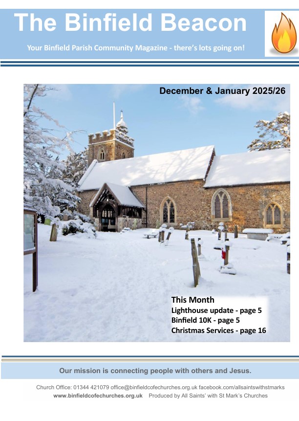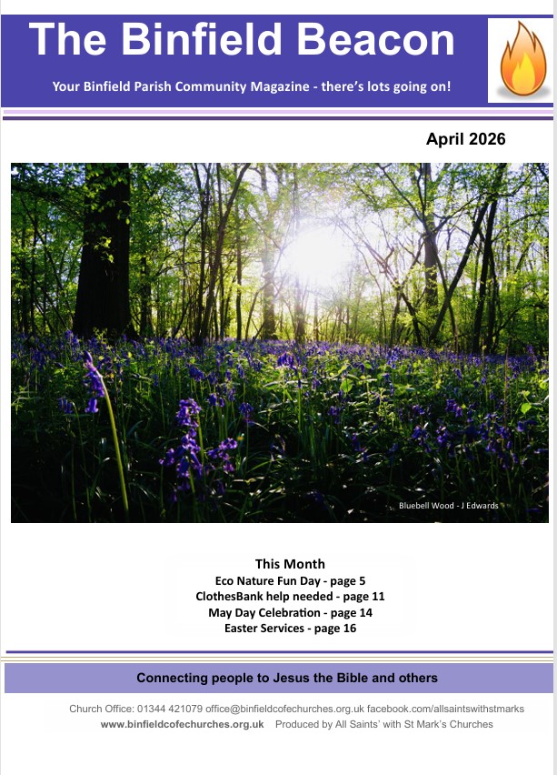The Binfield Beacon is the community and parish magazine for Binfield. It is produced by All Saints’ with St Mark’s Churches monthly with a double edition in the summer and over Christmas, so 10 editions per year.